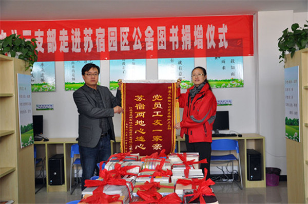 活動現(xiàn)場,陳彤彤代表蘇大教服集團黨委物業(yè)三支部捐贈了《紅樓夢》、《中國文學》、《管理學》等書籍20余種310冊和羽毛球拍、乒乓球拍等文體用品;張驥代表建發(fā)公司向蘇大教服集團黨委物業(yè)三支部贈送了題為“黨員工友一家親,蘇宿兩地心連心”的錦旗,以示感謝。