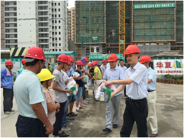 2016年7月27日上午,為切實做好建筑工地防暑降溫工作,讓施工人員在溫馨的工作環(huán)境中安全作業(yè),園區(qū)黨工委委員、管委會副主任、規(guī)劃建設(shè)局局長許紹杰、副局長張循在開發(fā)公司副總裁劉建華的陪同下冒著酷暑慰問夢家園工地一線施工人員。