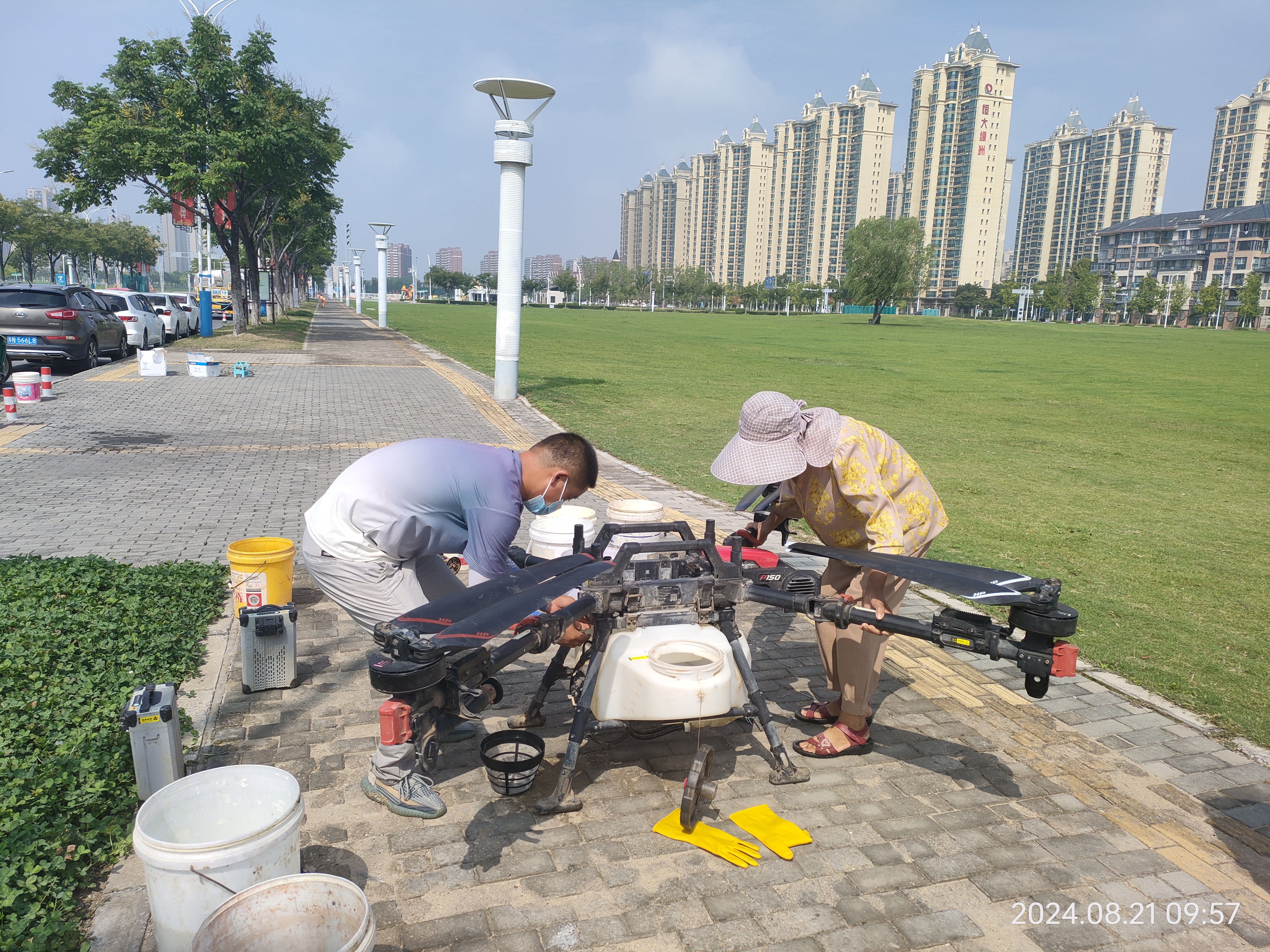 此次為園區(qū)首次采用無(wú)人機(jī)噴灑農(nóng)藥,在防治前,建發(fā)公司綠化管理人員和路段養(yǎng)護(hù)技術(shù)人員多次實(shí)地勘探區(qū)域內(nèi)試驗(yàn)點(diǎn),結(jié)合人流量等多種因素,最終噴灑農(nóng)藥區(qū)域選擇在中央商務(wù)區(qū)。在專業(yè)技術(shù)人員的操控下,植保無(wú)人機(jī)按預(yù)設(shè)路線不斷前進(jìn),細(xì)密的噴液滴通過(guò)霧化器處理后均勻地噴灑在草坪上。不到4小時(shí),一次全面精準(zhǔn)的病害防治工作已經(jīng)高效完成。