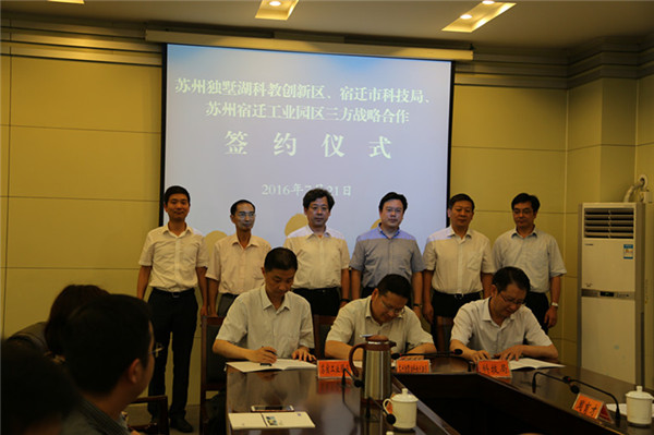 7月21日下午,蘇州獨墅湖科教創(chuàng)新區(qū)管委會、宿遷市科學技術(shù)局、蘇州宿遷工業(yè)園區(qū)管委會三方戰(zhàn)略合作協(xié)議簽約儀式在宿遷舉行。根據(jù)協(xié)議,三方將在科技資源轉(zhuǎn)移、科技平臺建設以及科技環(huán)境優(yōu)化等方面推進合作。這是蘇宿兩地合作內(nèi)涵逐步深化、合作領域不斷拓寬、合作水平全面提升的重要體現(xiàn),更是深入貫徹落實省委、省政府部署的重要舉措。市委副書記、市長王天琦,副市長、蘇宿工業(yè)園區(qū)黨工委書記、管委會主任方文浜,市政府秘書長章其波見證簽約。